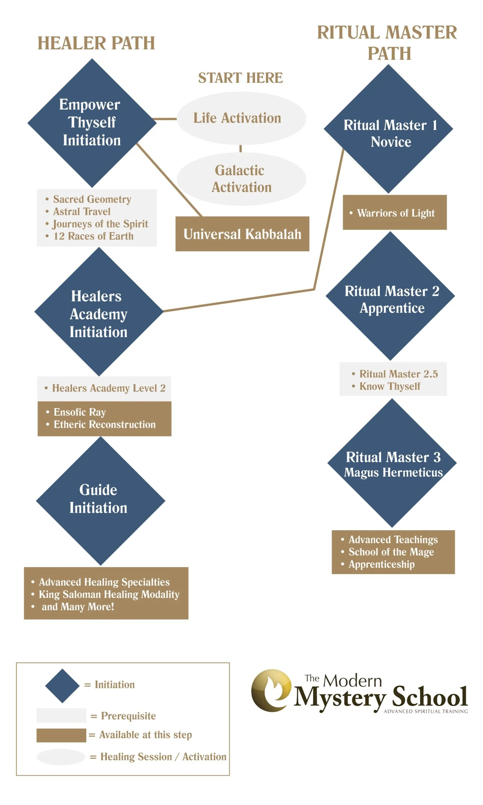 Everyone starts with a Life Activation. This one on one session will unlock your higher potential. From there, the Empower Thyself Program and Initiation becomes available. After your Initiation into the Great Brotherhood/Sisterhood of Light, the Path of Ascension and further training in the Modern Mystery School then become available to you!